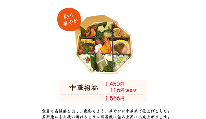 彩り豊かなおかず多種 季節感、ご馳走感いっぱい